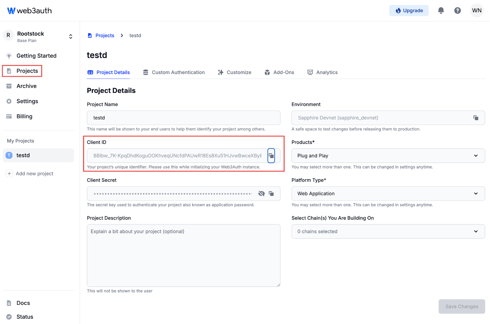 • Copy the Client ID from the dashboard. This will be used for initializing Web3Auth.