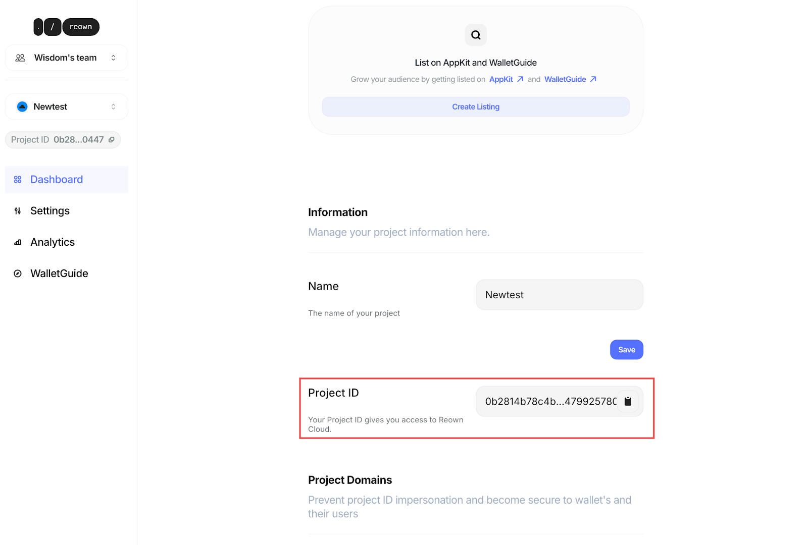 • Copy the Project ID provided by WalletConnect.