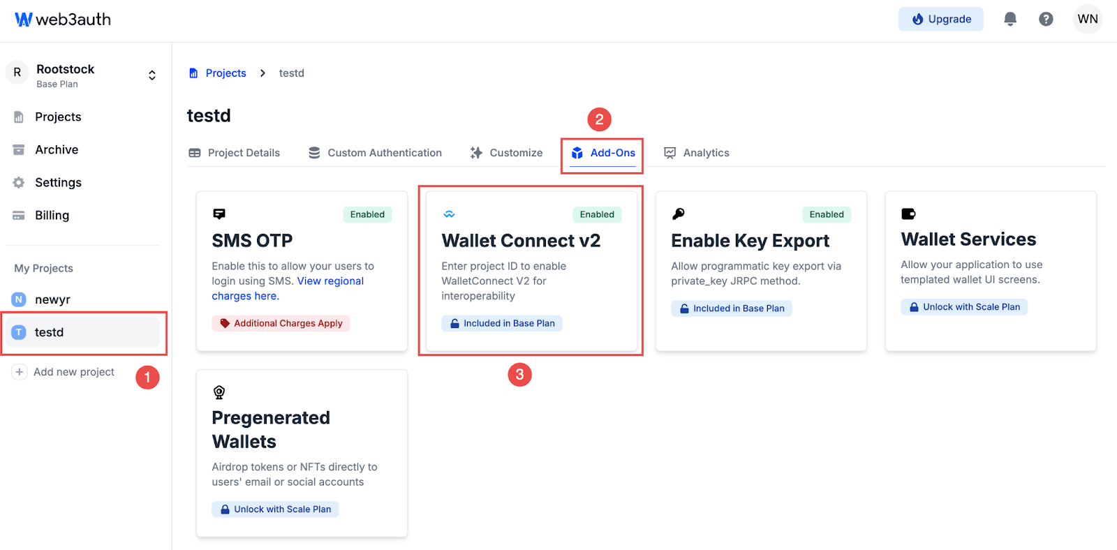 • Go to the Web3Auth dashboard, and navigate to Dashboard > Project > Add-ons