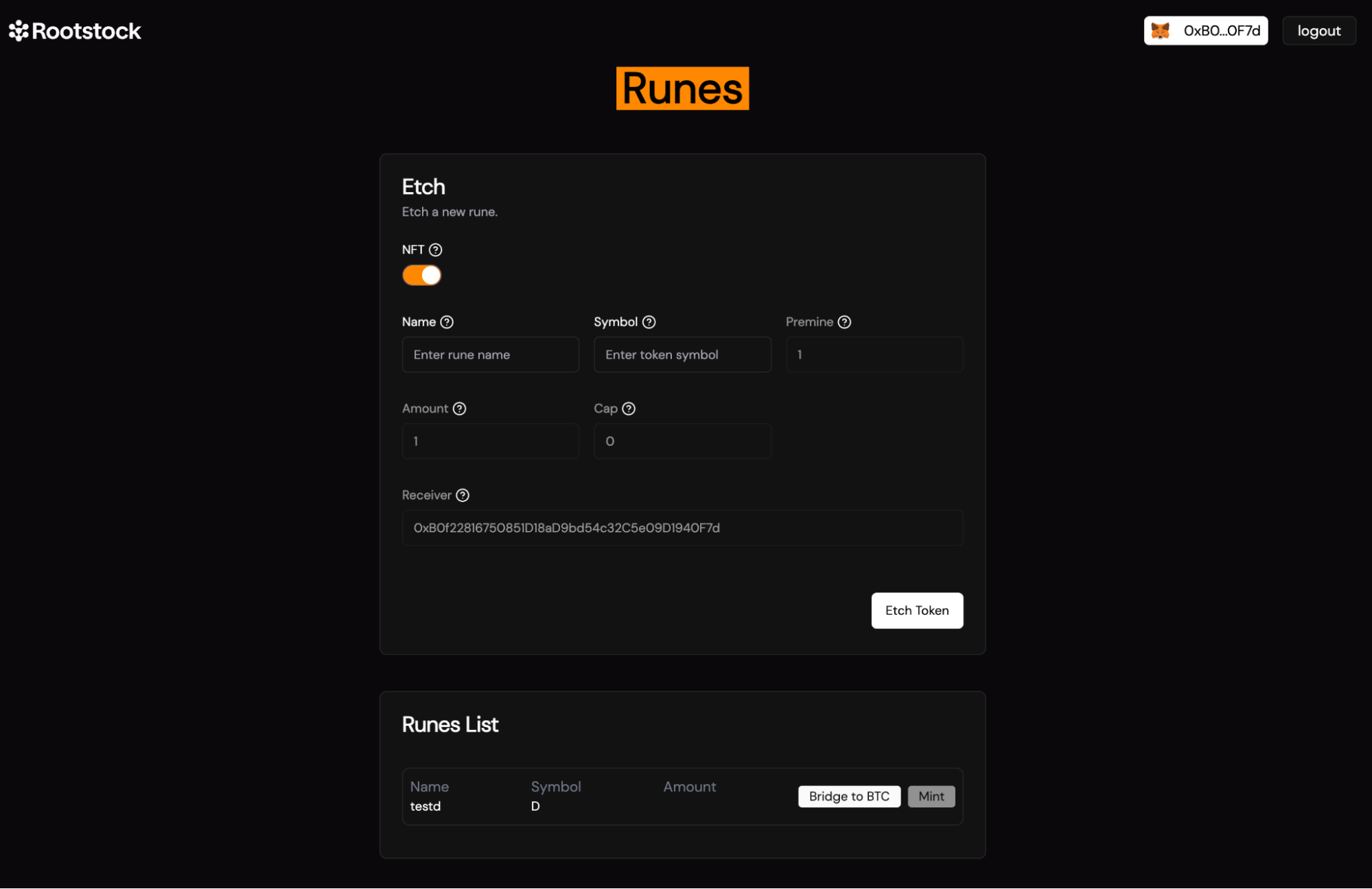 • Description: This will automatically fetch your Rootstock wallet address where the minted runes will be sent.
