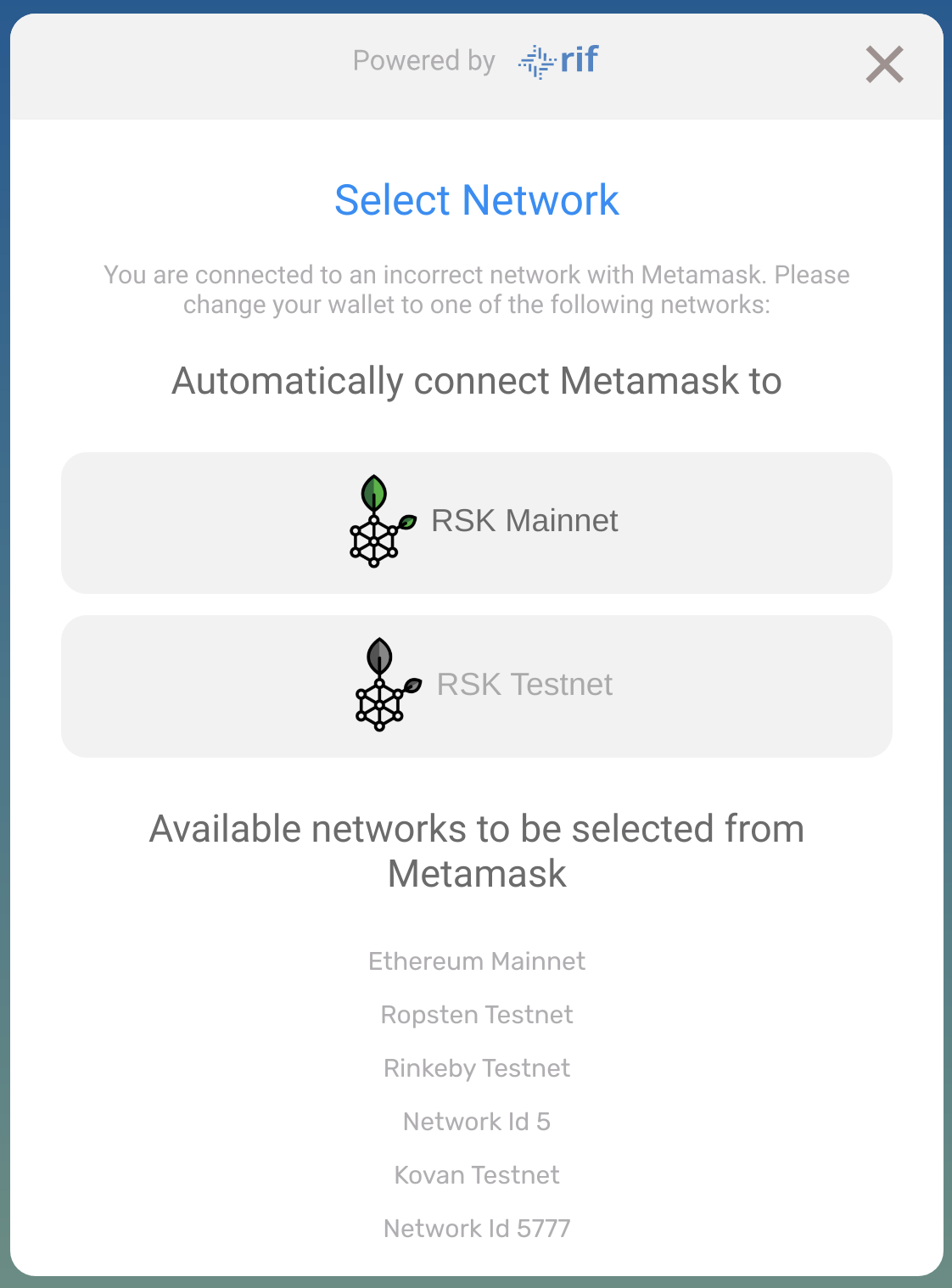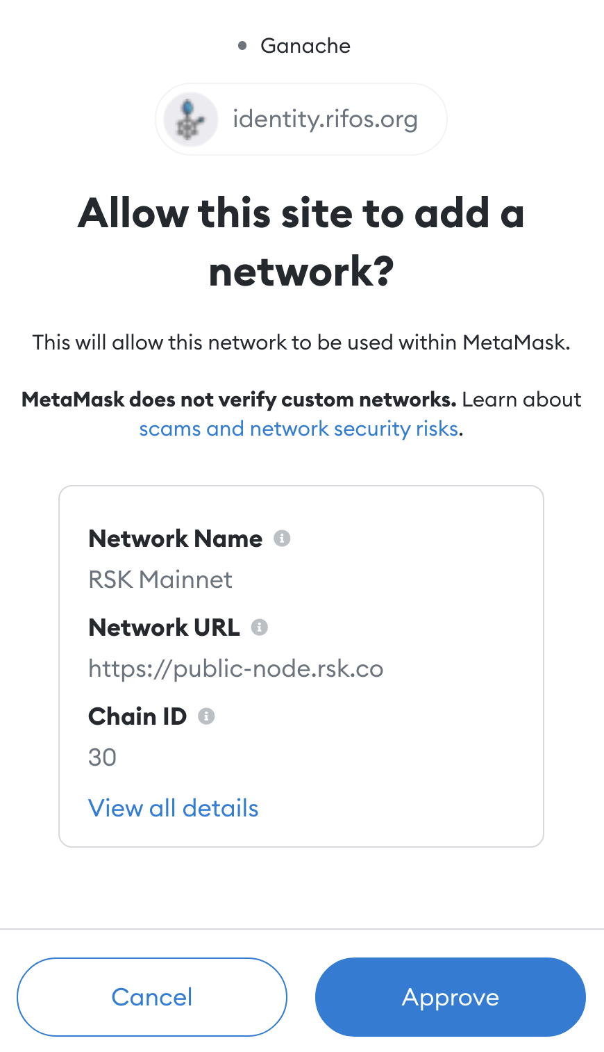 Alternatively, you can do this automatically, by visiting identity.rifos.org, and when you attempt to connect using MetaMask, you will get presented with the following: